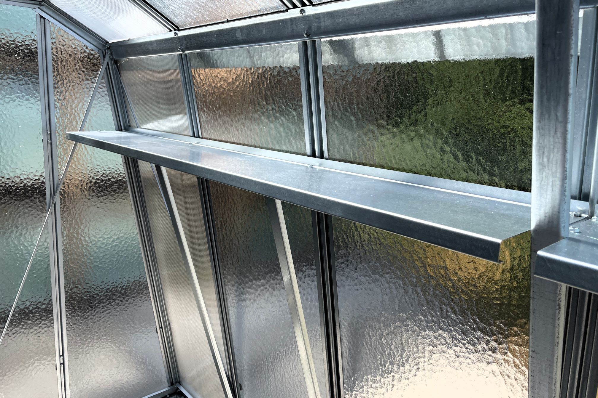 Upozornenie – vo fotogalérii sa nachádzajú fotografie zo skleníka Hobby H 7 (police však vyzerajú úplne rovnako, len sú prispôsobené pre kolmé steny skleníka).
